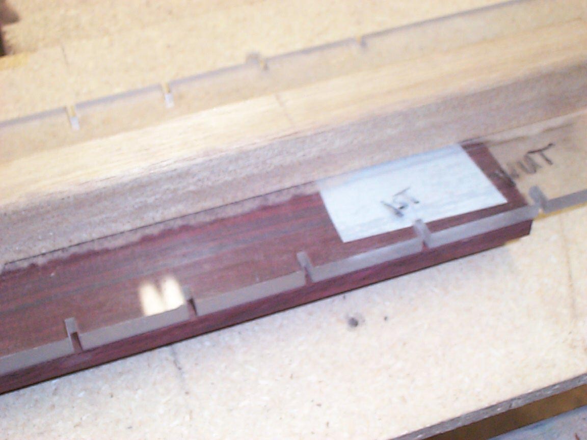 The fretboard blank gets stuck to an acrylic template in order to cut the